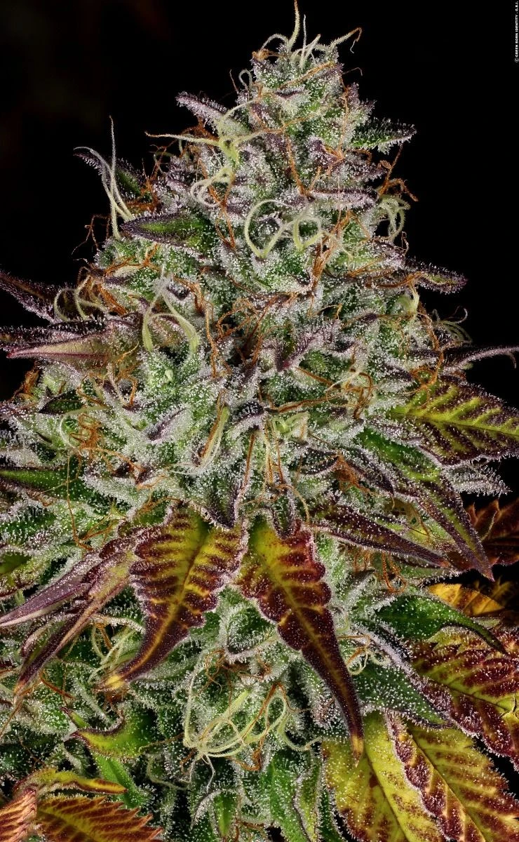 As flowering progresses the foliage takes on dramatic shades of vibrant reds, violets and blues, bringing some excellent eye candy to admire during the growing stage. The sativa fuelled growth and solid branch scaffolding is complemented by its indica infused bud growth pattern, producing chubby, swollen buds. Where this strain differs from many Cali varieties is the frosting supplied by the extra resin production qualities of this plant, illustrated by the trichome layer covering the flowers like the dump of fresh snow.