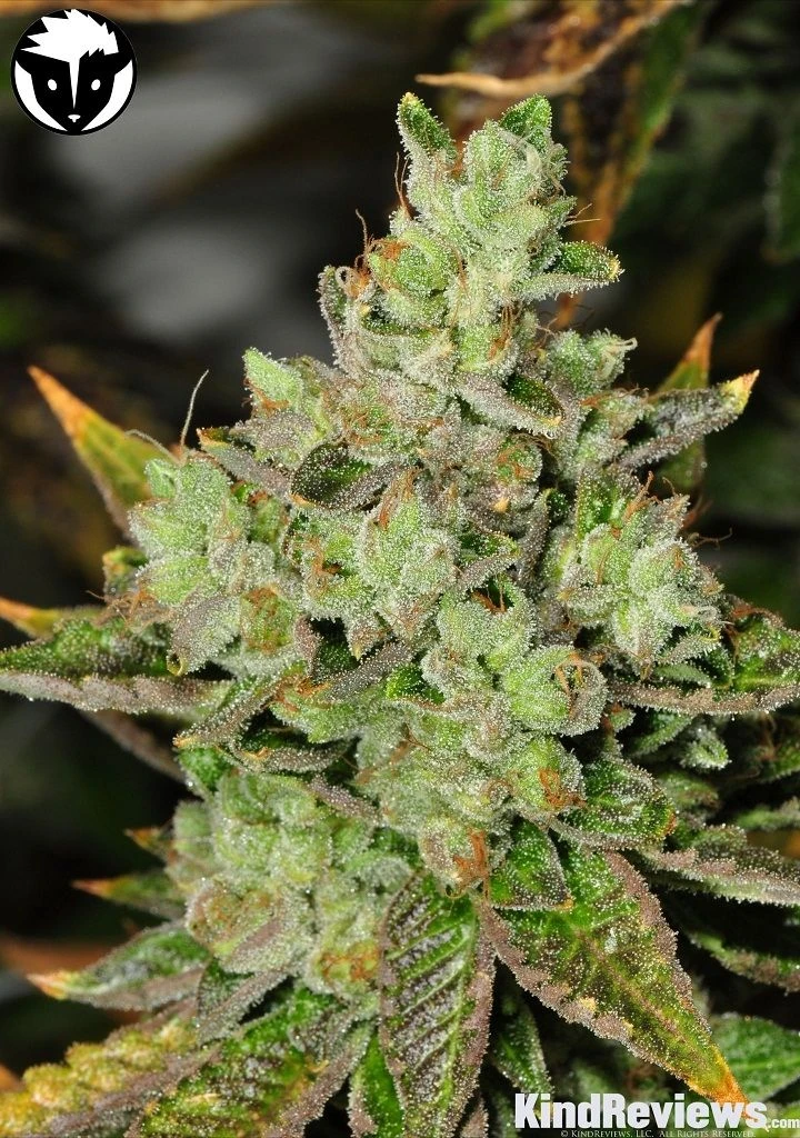 This strain’s buds range in size from small to medium and cling together in elongated, almost cylindrical shapes. They have the unmistakable structure of other indica-dominant varieties, with leaves curled tightly inward, forming a solid and compact flower. The leaves themselves are a bright spring green and are twisted through with vibrant orange hairs (which are actually pistils, botanical structure meant to catch pollen from fertilizing male plants). A carpet of translucent white trichomes covers the inner and outer surfaces of these nuggets, making them very difficult to break up by hand.